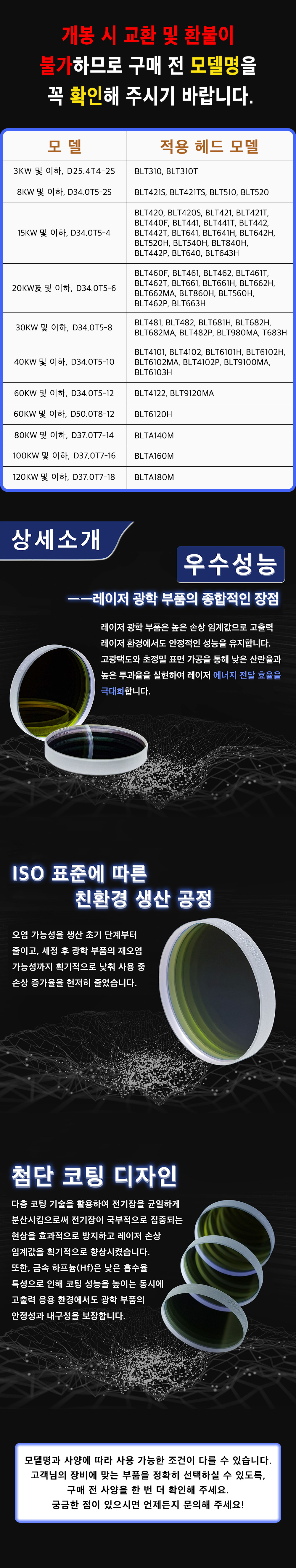 성능 우수, 균열없음, 치핑없음, 첨단 코팅, 고온고압에 강함, 뛰어난 광학 성능, 에너지 전달 효율 극대화